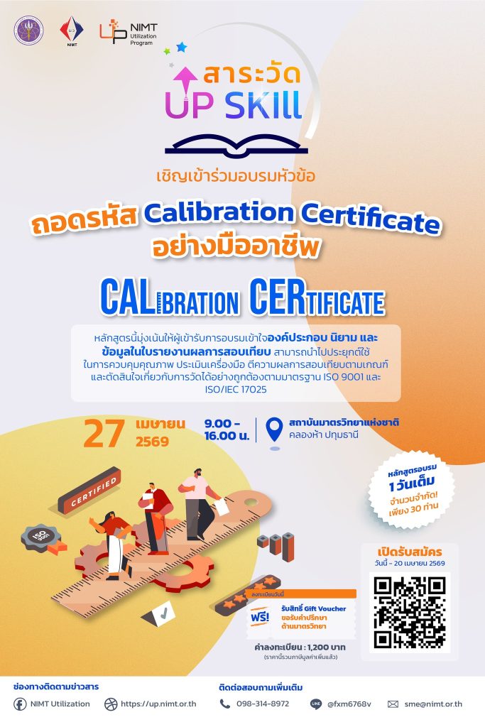 ✨🇹🇭โครงการขับเคลื่อนการนำผลงานวิจัย นวัตกรรมและโครงสร้างพื้นฐานด้านมาตรวิทยาไปใช้ประโยชน์ (NIMT UP) ของ สถาบันมาตรวิทยาแห่งชาติ จัดอบรมหัวข้อ"การใช้งานใบรายงานผลการสอบเทียบ (Calibration Certificate)" ครั้งที่ 1 ในวันจันทร์ ที่ 27 ตุลาคม 2568 ณ สถาบันมาตรวิทยาแห่งชาติ คลองห้า ปทุมธานี💻⚙️📄📐📏